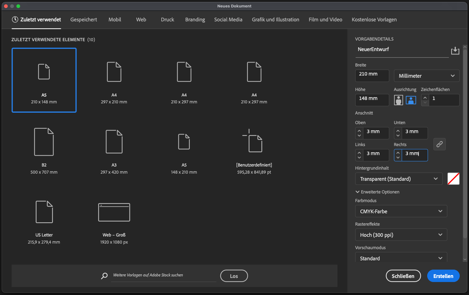 In Adobe InDesign fügst du den Sicherheitsabstand einfach beim Erstellen deiner Datei hinzu. Gehe zum Feld „Ränder“ und stelle den Rand auf 3 mm ein. Vergiss nicht, auch den Beschnitt auf 3 mm einzustellen! Sobald du die Datei öffnest, siehst du zwei Linien: die rote Linie ist der Beschnitt, und die lila Linie ist der Sicherheitsabstand.
